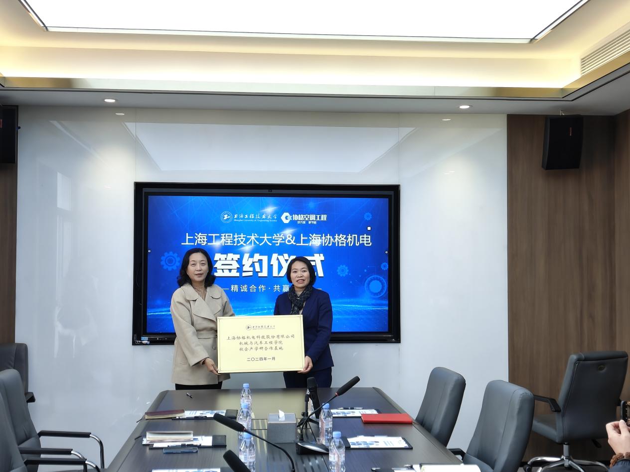 会上,虞蓉书记代表公司向上海协格机电科技股份有限公司授校企产学研合作基地牌。公司能源与动力工程系主任邓胜祥教授与张美玲经理进行校企合作签约。
