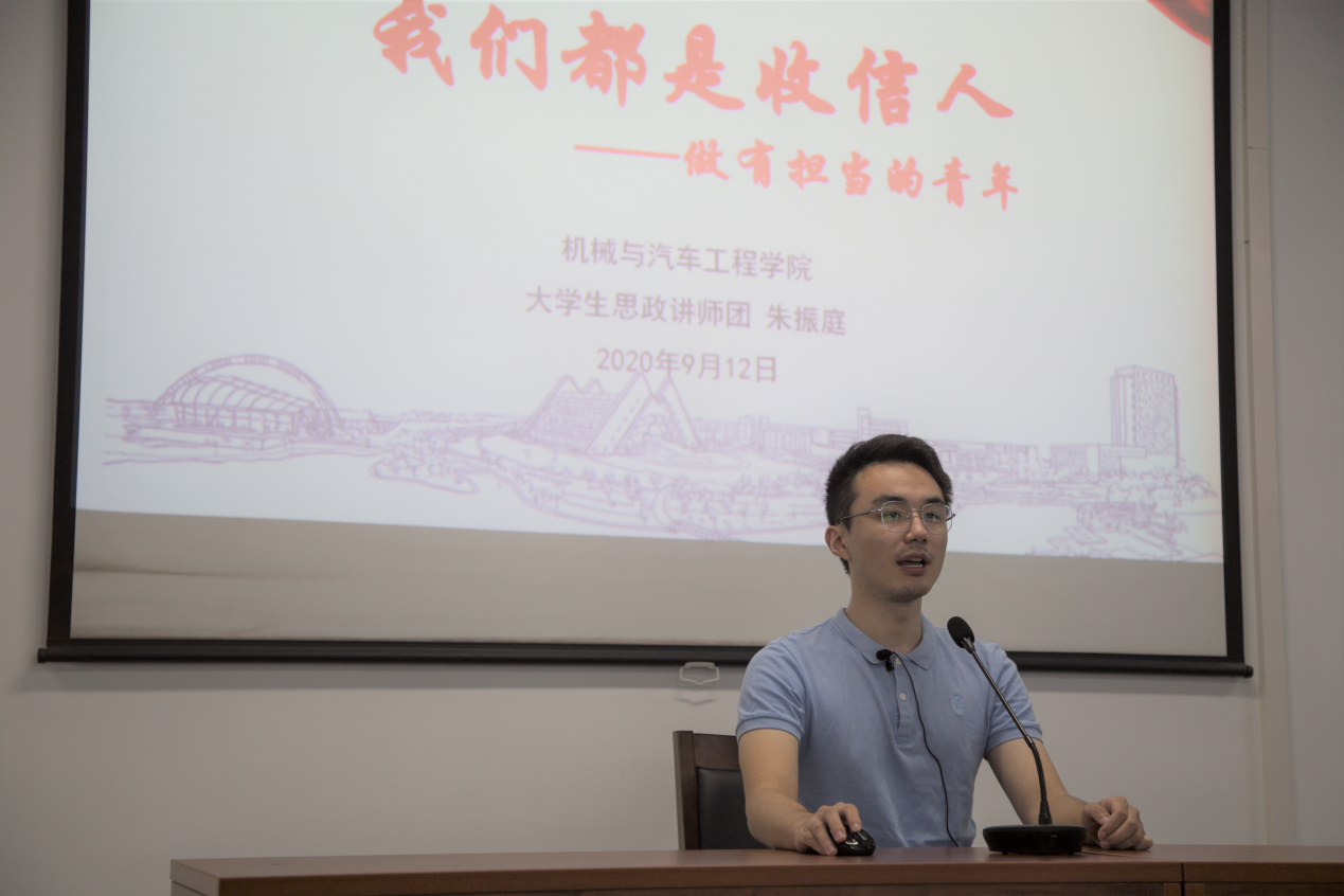 为深入学习贯彻习近平总书记给北京大学援鄂医疗队“90后”党员、复旦大学青年师生党员、中国石油大学(北京)克拉玛依校区毕业生的重要回信精神,9月12日yl6809永利老员工思政讲师团在线上开展了“我们都是收信人”主题宣讲,来自机械工程专业的朱振庭宣讲的题目是“做有担当的青年”。