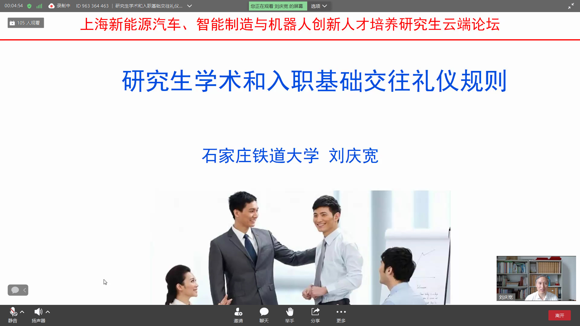 2024年9月7日上午9时,石家庄铁道大学工程研究中心主任,国家百千万 人才、教育部新世纪优秀人才,博士生导师刘庆宽教授以《研究生学术和入职基础交往礼仪规则》为题,为暑期公司的学员们开展了线上专题讲座。本次讲座由yl6809永利副经理刘新田教授主持。
