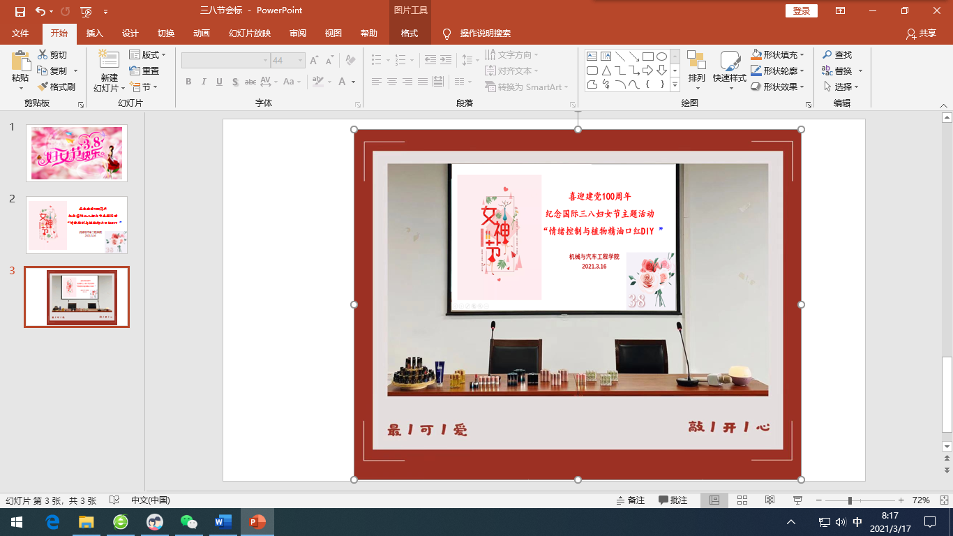 在三八妇女节到来之际,也是公司十四五开局之年,2021年3月16日下午yl6809永利女教师欢聚一堂,开展了喜迎建党100周年纪念国际三八妇女节主题活动“情绪控制与植物精油口红DIY”,活动邀请国家植物精油疗法高级康复理疗师周怡老师和她的团队,讲述精油的起源、制作和作用,并带领老师们制作了一支精美的植物精油口红。