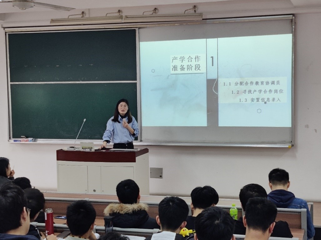 产学合作教育辅导员王淼为2020级员工详细介绍产学合作教育相关内容。她向员工们介绍了公司产学合作教育内涵,并详细解释产学合作准备、实施、总结三个阶段的具体工作流程、步骤以及注意事项,并解答了同学们关于产学合作教育的相关问题。