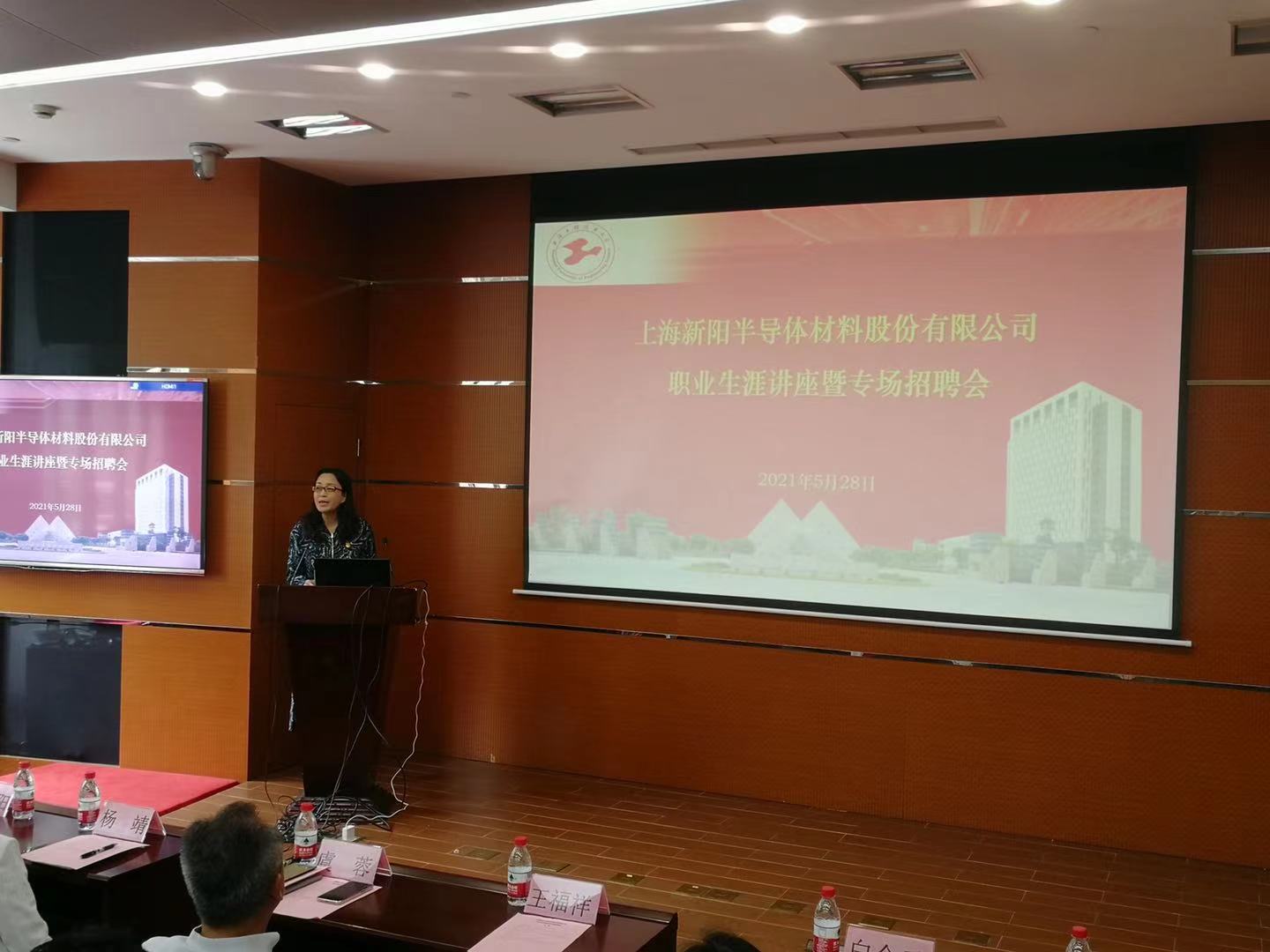 最后,上海新阳半导体材料股份有限公司副总经理白金香做企业招聘宣讲。她结合公司基本情况,对公司的职位设置、岗位需求、企业人才培养路径、未来职位发展方向等做了详细介绍,她希望更多工程大人加入到企业中,共同推进我国半导体行业的进步和发展。