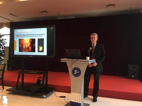 应国际交流处、机械工程公司邀请,瑞士西北应用科技与艺术大学工程公司Markus Loepfe教授于11月22日下午在行政楼19楼举办了一场“现代消防系统的创新之路”的精彩讲座。讲座由国际交流处张忠魁副处长主持,机械工程公司潘颖副经理、部分教师和研究生一起聆听了讲座。
