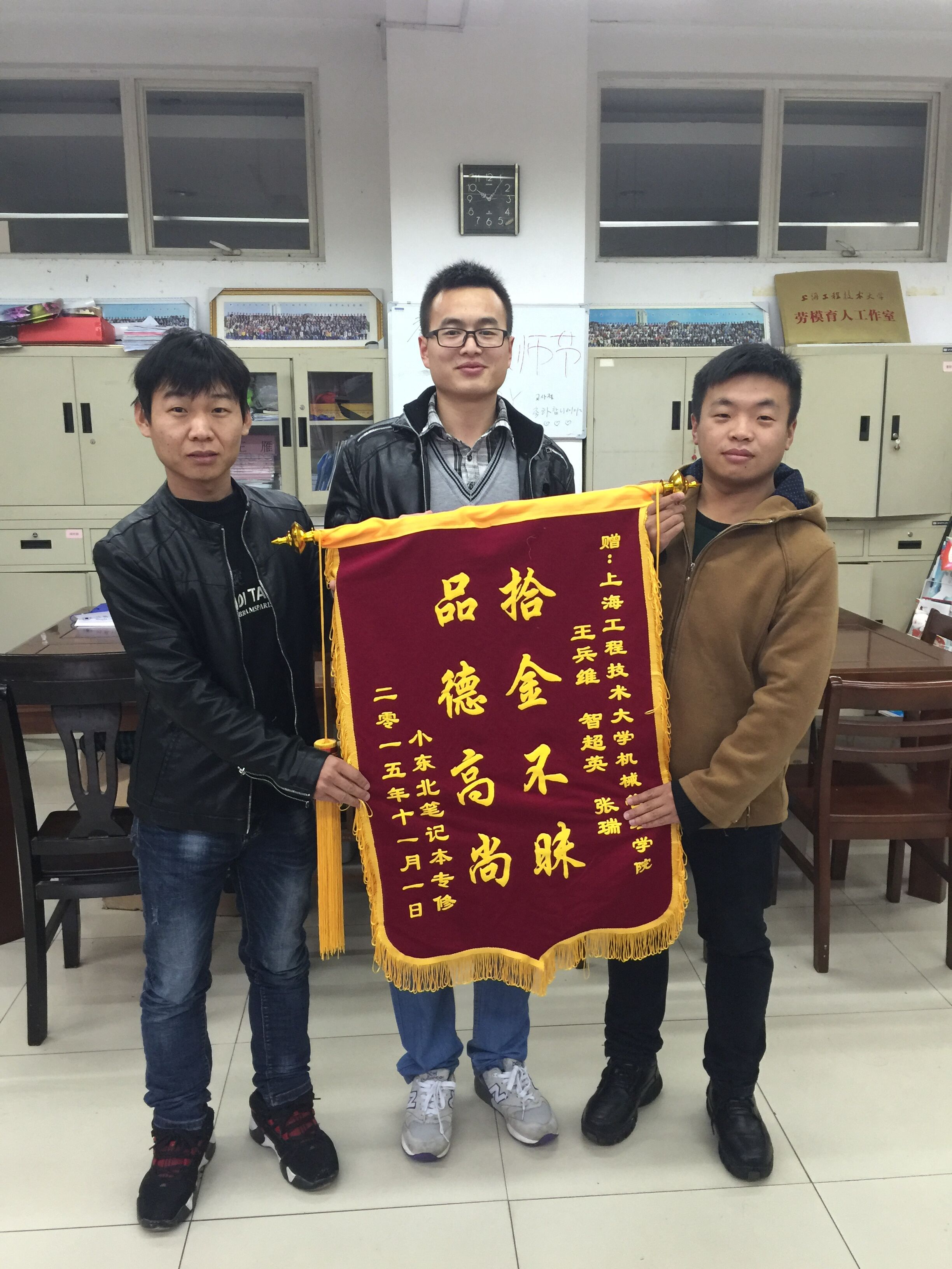 今天,失主本人送来锦旗校对张瑞、王兵维、智超英三位同学的行为给予表扬和肯定!因为在提倡和谐社会的今天,这种行为更是值得大力提倡和鼓励。