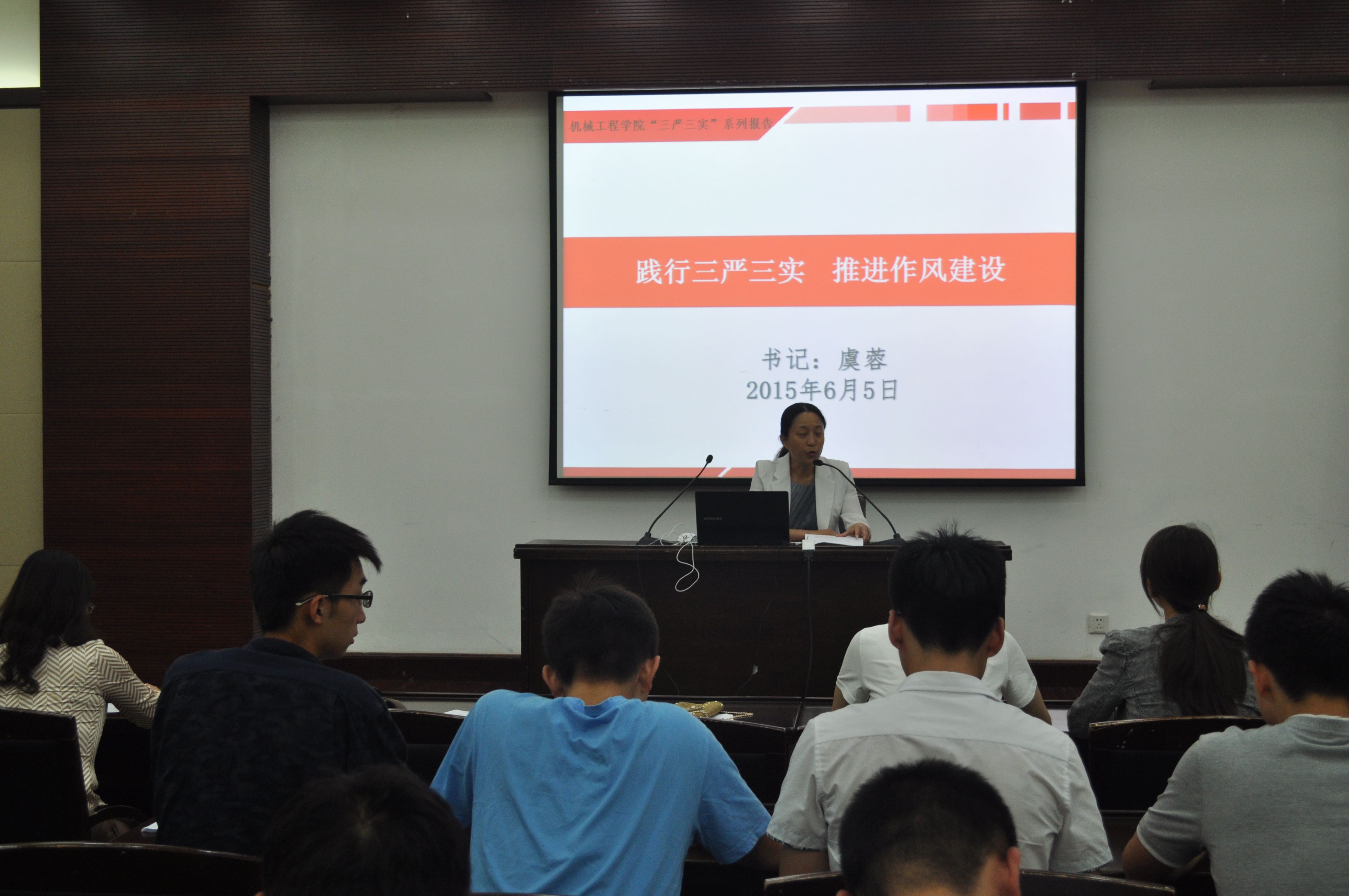 公司虞书记主持并做报告,她分析了“三严三实”提出的历史背景,剖析了“三严三实”的基本内涵和重大意义。她强调,习近平同志提出的“三严三实”要求,是对党的建设理论的丰富和发展,体现了新一届中央领导集体从严从实的鲜明执政风格,是党员干部的修身之本、为政之道、成事之要、做人之基,是不断巩固夯实党的执政地位的客观要求,是推进改革发展稳定的重要保障,是新时期加强作风建设的行动指南,是打造高素质执政骨干队伍的内在要求。她要求公司全体党员干部必须做到“三严三实”,努力营造良好的政治生态环境。要按照“三严三实”要求修身做人,始终做到信念坚定、对党忠诚;要按照“三严三实”要求为官用权,始终做到执政为民、正确用权;要按照“三严三实”要求干事创业,始终做到求真务实、勇于担当。全体党员干部特别是公司领导班子要尽心尽责;严于律己,清正廉洁;贴近师生,解决问题。