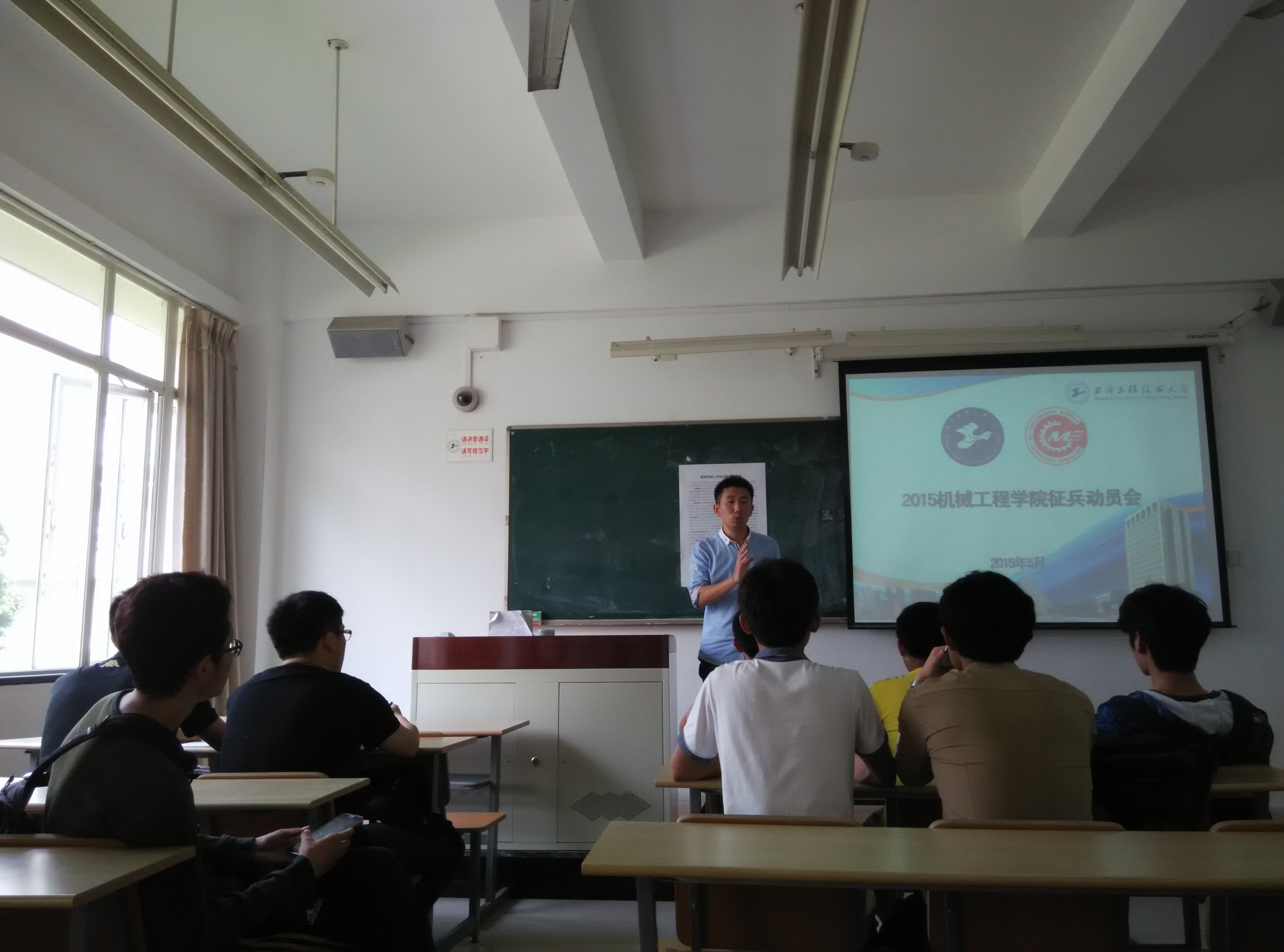 携笔从戎报国,军营放飞梦想。为鼓励老员工参军入伍、报效祖国,5月19日,机械工程公司在C114教室召开2015年征兵宣讲动员会,会议由负责征兵工作的辅导员董春亮老师主持。参加动员会的有来自各个班级的同学们。宣讲动员会上董老师详细地介绍了2015年老员工征兵工作的时间和要求,征兵的程序和方法,应征入伍老员工享受的优待政策等。现场同学们也积极提出一些疑问,董老师详细一一作了解答,同时鼓励大家把握住机会,踊跃报名参军入伍,一方面献身国防事业,为保卫祖国建功立业,另一方面也让自己的人生有一段丰富宝贵的人生经历,有一个难得的提升能力的成长平台。