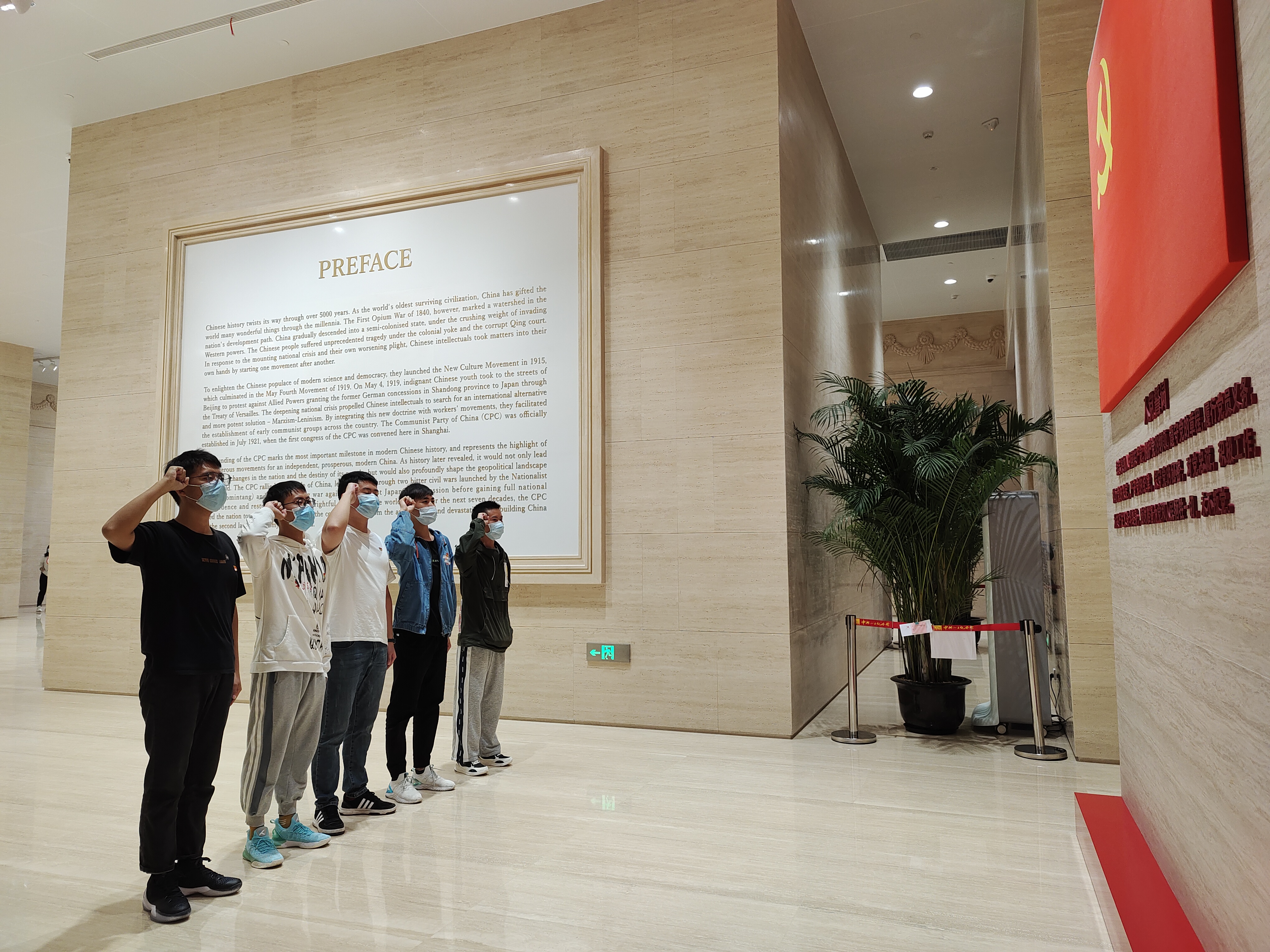 在遵守疫情防控的条件下,党员同志们统一佩戴徽章有序入馆。在庄严的党旗下,高举右手,重温入党誓词。铿锵有力的声音抒发对党的热爱之情,表达为共产主义奋斗终身的决心。