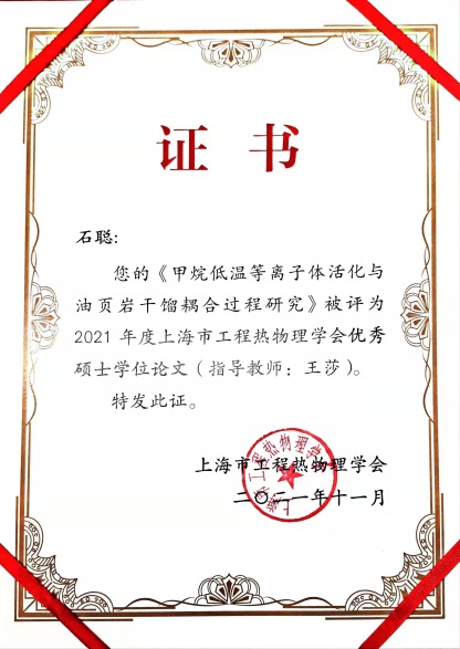 11月6日,上海市工程热物理学会第九届理事工作会议暨2021学术年会在上海科学会堂(南昌路47号)召开,会上颁发了2021年度上海市工程热物理学会优秀博士学位论文奖和优秀硕士学位论文奖,公司yl6809永利石聪同学的硕士学位论文《甲烷低温等离子体活化与油页岩干馏耦合过程研究》,荣获学会优秀硕士学位论文奖(硕士学位论文排名第一),指导老师为王莎副教授。本届参评论文为2019年1月1日至2021年6月30日获得博士硕士学位者的学位论文,其他获奖单位包括上海交通大学、复旦大学、同济大学、华东理工大学、上海理工大学、上海电力大学。