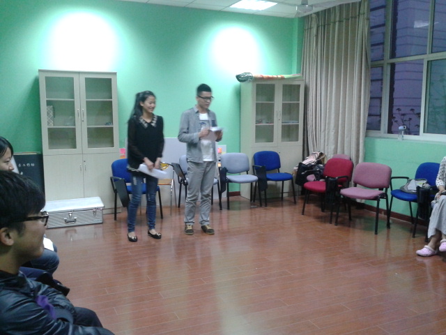 在活动的最后,我们又开始了一个比较刺激的游戏,在场的所有参与培训的干事们都起立,围成一个大圆圈,并且跟着音乐的节奏走着,当音乐停止的时候,主持人会说出一个数字,然后大家要迅速的找到相应的人数抱在一起,而被剩下的就被淘汰出局并且接受惩罚。