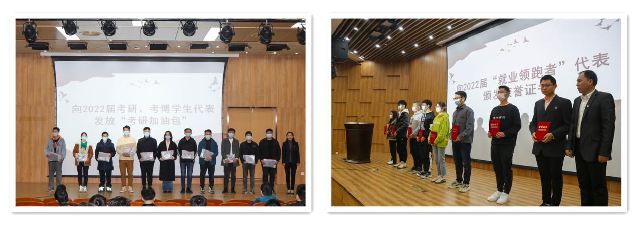 发言环节,公司“就业领跑者”代表2021届毕业生司佳蒙发言,他从求职心态、求职过程中知识和技能储备、如何书写脱颖而出的简历、面试技巧四个方面与大家分享求职过程中的心路历程,鼓励大家调整就业心态,拓宽思路和眼界,做好职业规划。2021届考取研究生代表丁明杰从考前心态调整,复习策略,考前冲刺等亲身经历进行分享发言,考研同学少走弯路,争取金榜题名。