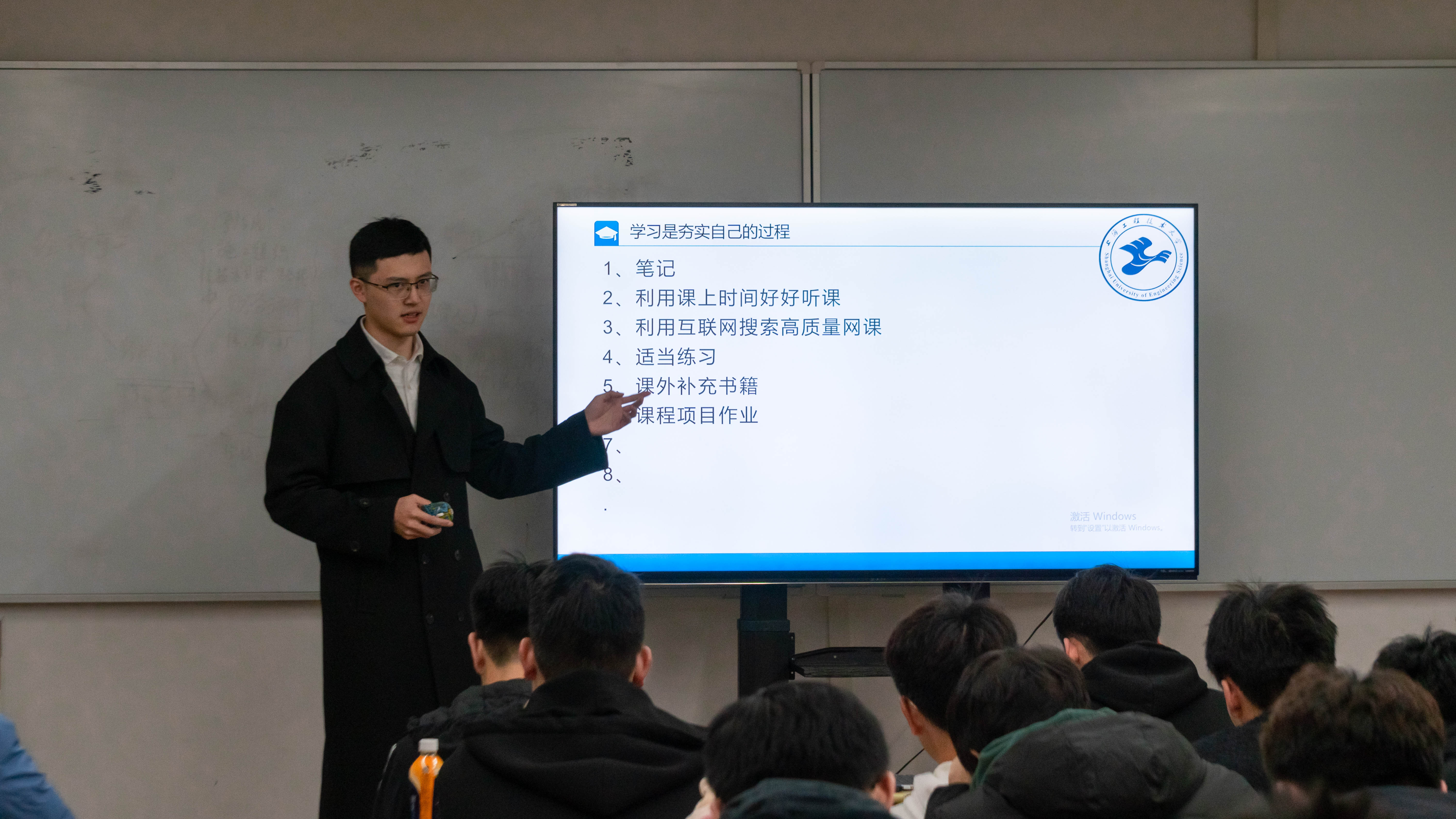 2019级汽车服务工程专业的陈存同学,为大家介绍了老员工创新实验室平台,并对在校期间如何高效率选课进行了详细的讲解,嘱托大家要善于提高学习效率,学会享受老员工活。