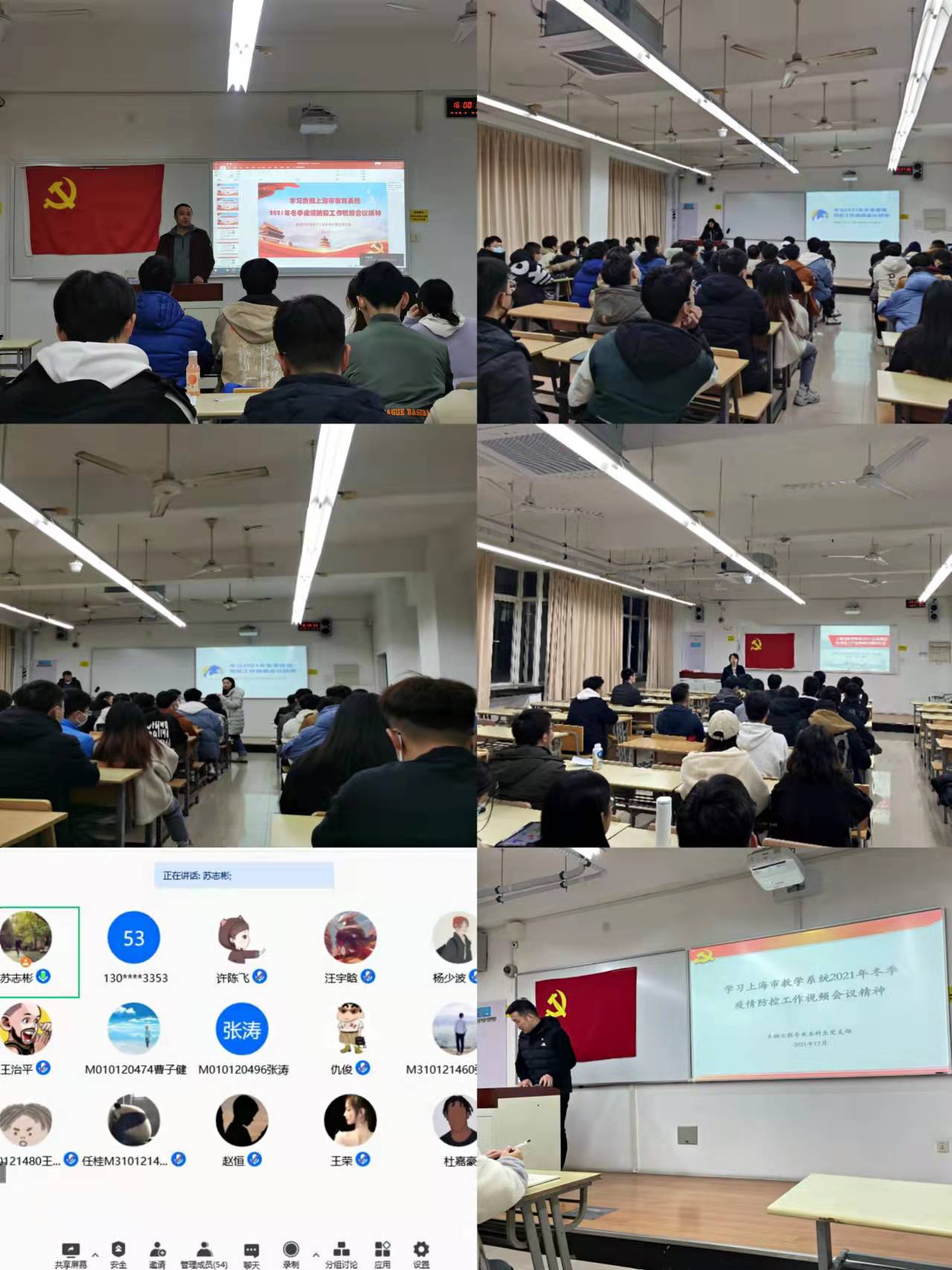 机械设计制造及其自动化专业员工党支部除了召开支部会议学习贯彻落实相关会议精神外,支部书记汪文婷及支部副书记谢腾骁老师召开了班团例会。班团干部通过班会、群接龙等方式传达学习贯彻落实上海市教育系统2021年冬季疫情防控工作视频会议精神。