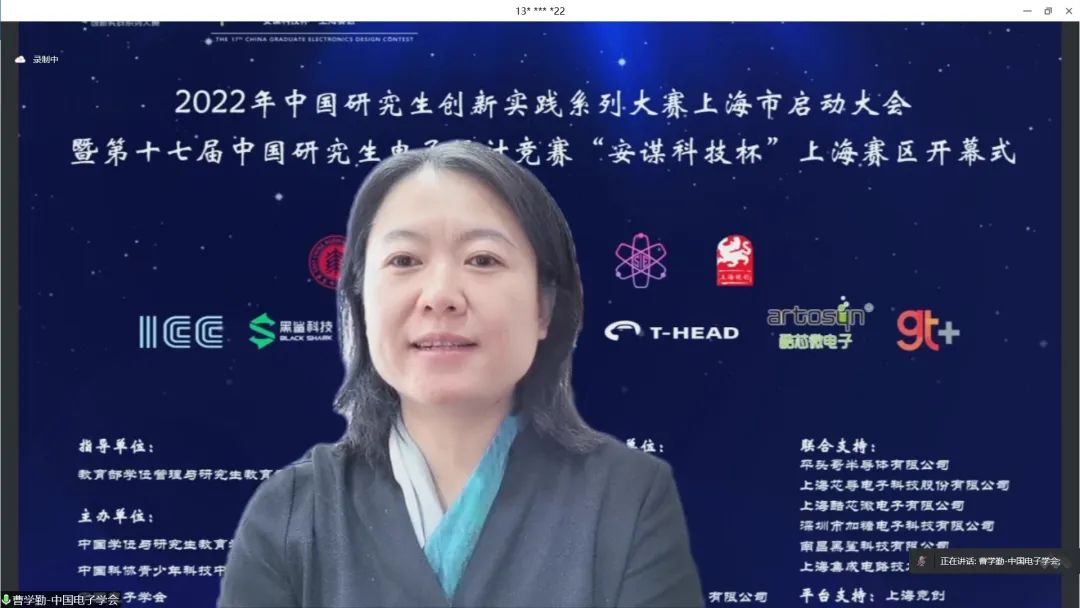 中国电子学会副秘书长曹学勤代表中国电子学会对2022“研电赛”上海赛区的开幕表示祝贺。她指出,上海赛区设立五年来,紧跟时代步伐,广泛凝聚需求,创新竞赛组织模式,优化常态化联络机制,组织凝聚力、竞赛影响力持续提升,以优异的赛事成绩展示了上海赛区人才培养的优秀成果。在当下这一特殊时期,大赛的启动彰显了上海赛区的责任和担当。