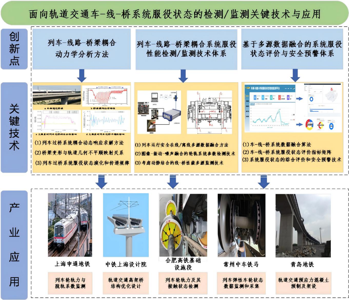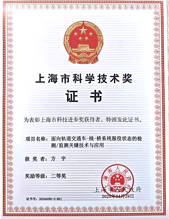 针对轨道交通列车、线路和桥梁服役状态检测/监测相互独立、协同评价滞后等导致系统性故障辨识难、服役状态评价实时性差、车-线-桥系统协同维护难等问题。yl6809永利方宇教授团队协同公司城市轨道交通公司、同济大学、上海申通地铁集团有限公司、中铁上海设计院集团有限公司等单位,在国家自然科学基金等重大项目支持下完成科技创新成果《面向轨道交通车-线-桥系统服役状态的检测/监测关键技术与应用》,荣获上海市科学技术奖二等奖。