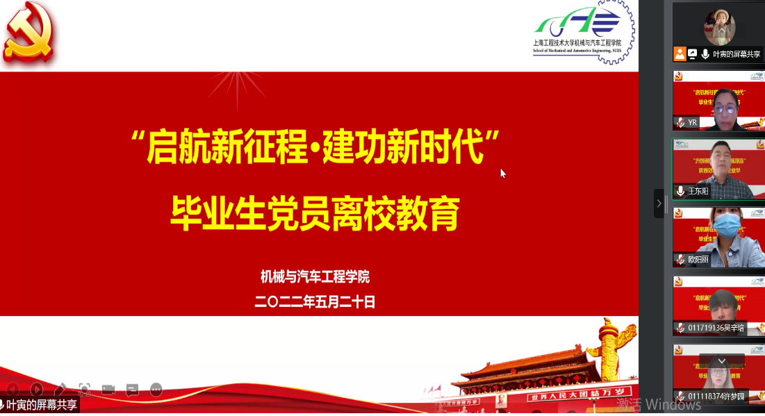 为切实抓好毕业生党员离校教育和管理工作,引导广大毕业生党员坚定信念、脚踏实地,不负青春韶华,开启人生新篇章。5月20日下午,公司党委线上举行“启航新征程·建功新时代”毕业本科生党员离校教育活动。公司党委书记虞蓉、副书记王东阳、“虹口突击队”成员李晓成、公司组织员、本科生党支部书记和全体2022届毕业本科生党员、党员代表等参加会议。本次离校教育活动由公司党委副书记王东阳主持。