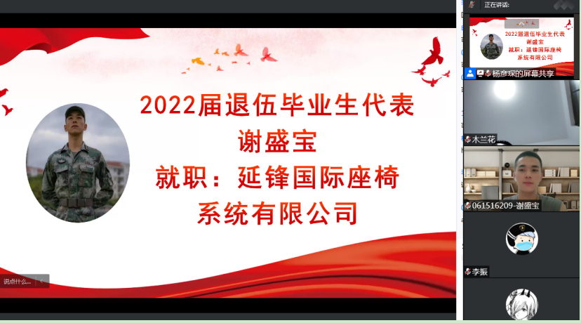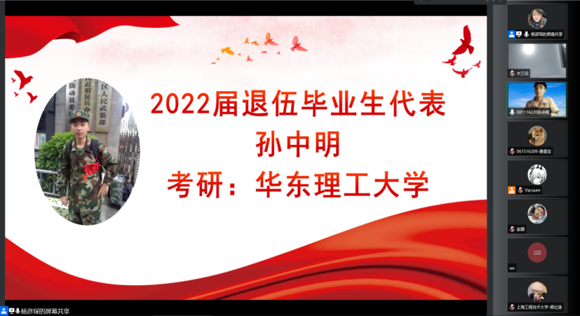 为了鼓励有志青年并使同学们能更直观的感受军营生活所带来的改变,会上邀请2022届毕业生中的两位退役士兵,谢盛宝和孙中明分别分享军营所带给自己的历练与思考,并从求职就业和考研备考不同的角度分享了自己的经验和建议。