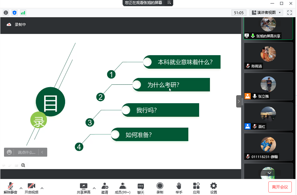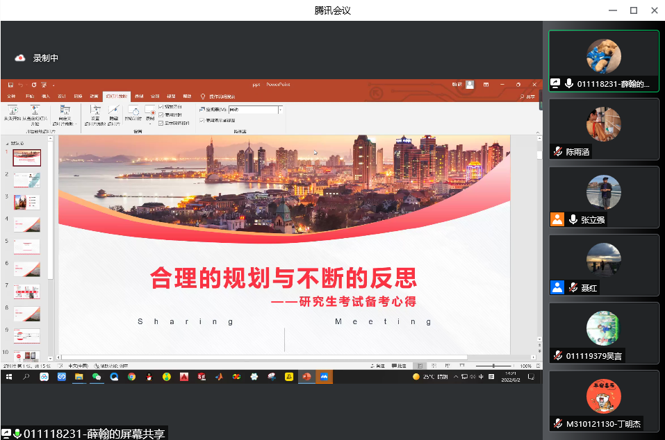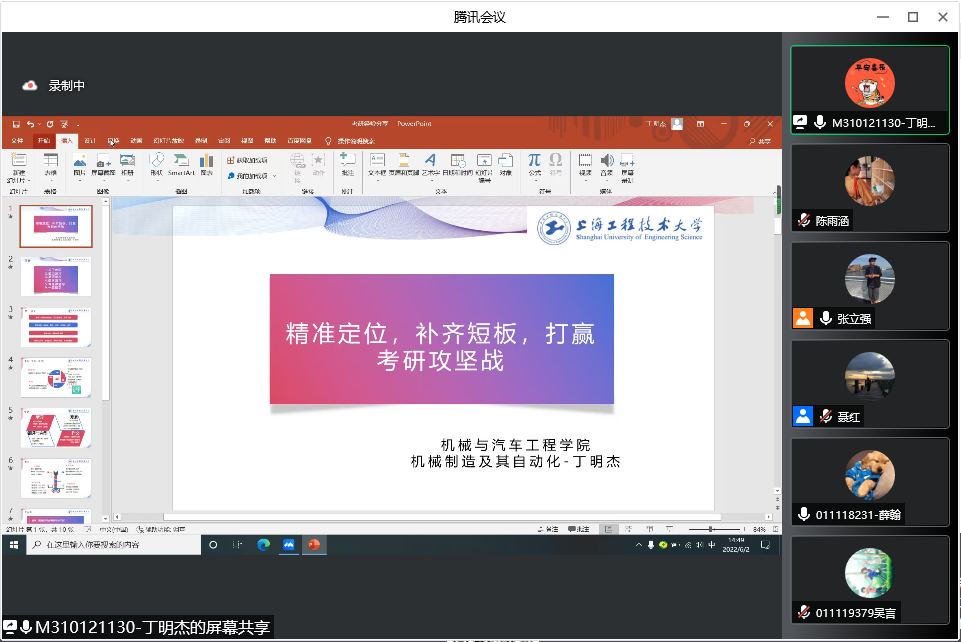 随后,已被同济大学录取的薛翰同学分享了他备考的心路历程,经验教训和上岸心得;公司研一在读的学长丁明杰分享了考研准备期信息的获取途径及后期每门课程的复习经验与方法,同时也建议学弟学妹们寻找研友,适当运动,以最好的状态迎接考试。