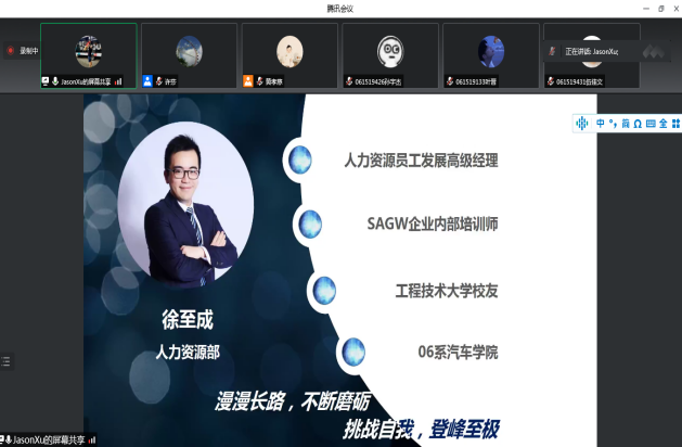 受疫情影响,今年车辆工程专业员工无法进入企业现场实习,为切实提升疫情下课程教学质量,解决在线教学中无法实现实训、动手操作的难题,在公司的大力支持下,6月24日下午,上海汽车变速器有限公司(以下简称上汽变速器)人力资源部员工发展高级经理徐至成应邀为2019级车辆工程岗位实习的全体员工开展线上讲座。岗位实习企业联络人黄孝慈老师,岗位实习指导老师许莎、刘淼、杨超、赵永礼在线参加了讲座。