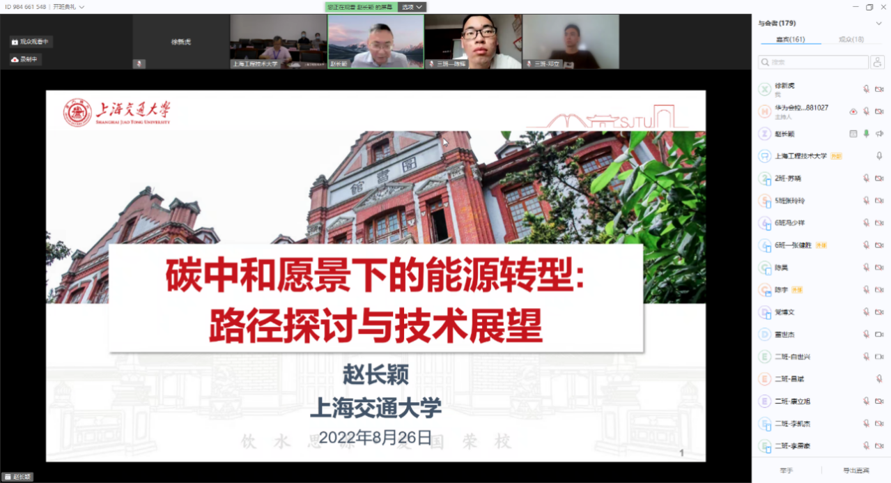 2022年8月22日上午,通过华为云会议视频平台,上海交通大学讲席教授、中英国际低碳公司经理、工程热物理研究所所长、国家特聘专家赵长颖为暑期公司做题为《双碳目标下的能源转型:路径探讨及技术展望》的线上专题讲座。讲座由yl6809永利副经理严祯荣主持。