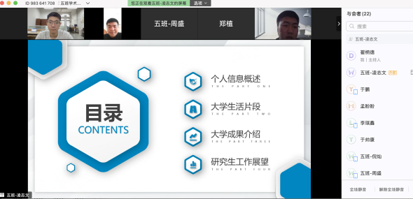 2022年8月31日,各个班的班长组织各班学员进行在线沙龙活动,主要的交流形式是学员进行PPT汇报,将自己感兴趣的研究方向或自己在暑期公司学到的知识相互分享。通过线上沙龙活动,增进了学员之间的相互了解,同时也有助于学员对专家讲座内容的有效吸收。