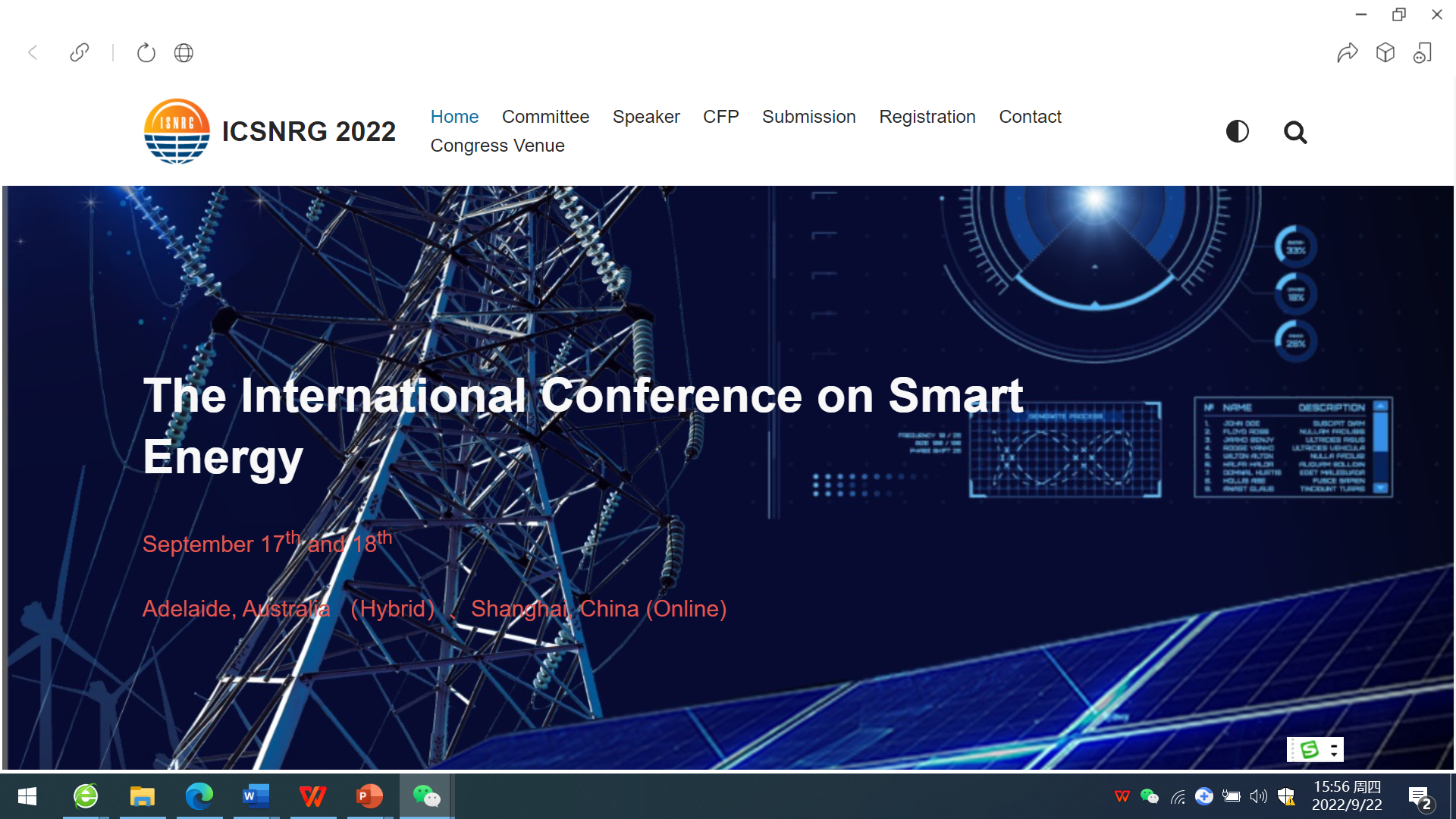 917-18日,2022智慧能源国际会议The International Conference on Smart EnergyICSNRG2022)在线上隆重举行。因新冠肺炎疫情影响,会议通过ZOOM会议平台在线直播。来自澳大利亚、法国、荷兰、美国、英国以及中国专家学者在线上共聚一堂,就智慧能源、低碳社区、可再生能源和存储以及相关人工智能(AI)应用领域热点问题进行了交流,分享研究和实践的前沿知识和经验。