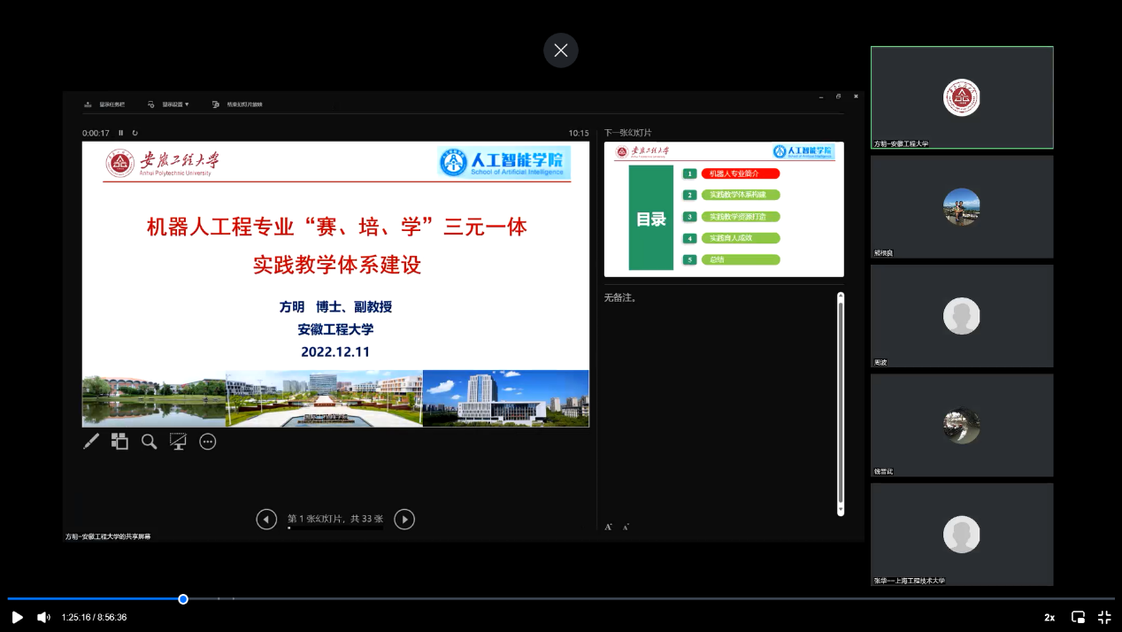 安徽工程大学机械工程公司(人工智能公司)方明副教授报告的题目为《机器人工程专业“赛、培、学”三元一体实践教学体系建设》,他详细介绍了安徽工程大学机器人工程专业实践教学体系的构建、实践教学资源的打造以及实践育人的成效等,充分说明了实践教学在机器人工程专业课程体系中的重要性。