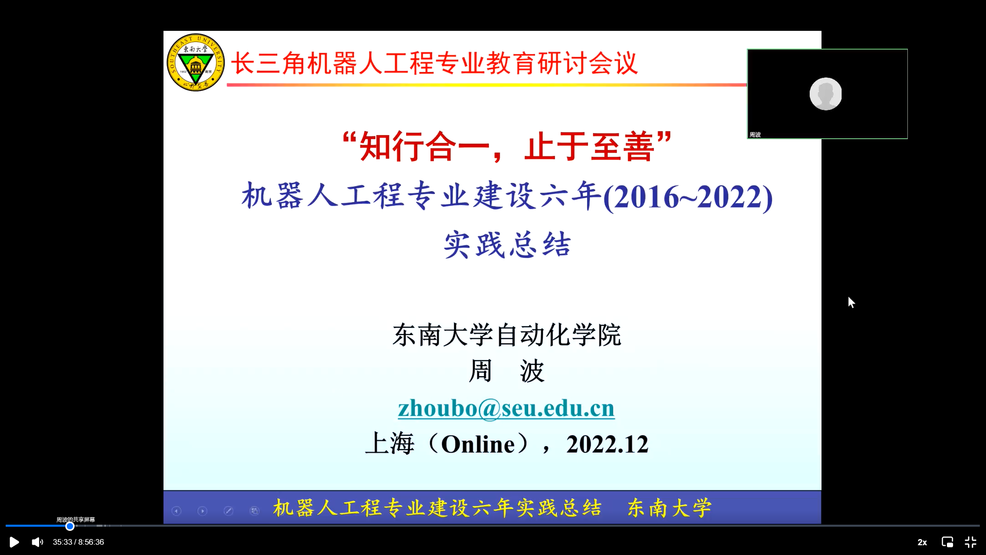 全国首家设立机器人工程本科专业的东南大学自动化公司机器人工程系主任周波副教授做了“知行合一,止于至善”《机器人工程专业建设六年(2016-2022)》实践总结报告。他讲述了机器人工程专业建设的需要与挑战,回顾了国内外机器人工程专业的现状,以及东南大学机器人工程专业建设取得的进展,最后总结机器人工程专业建设中存在问题以及一些思考。