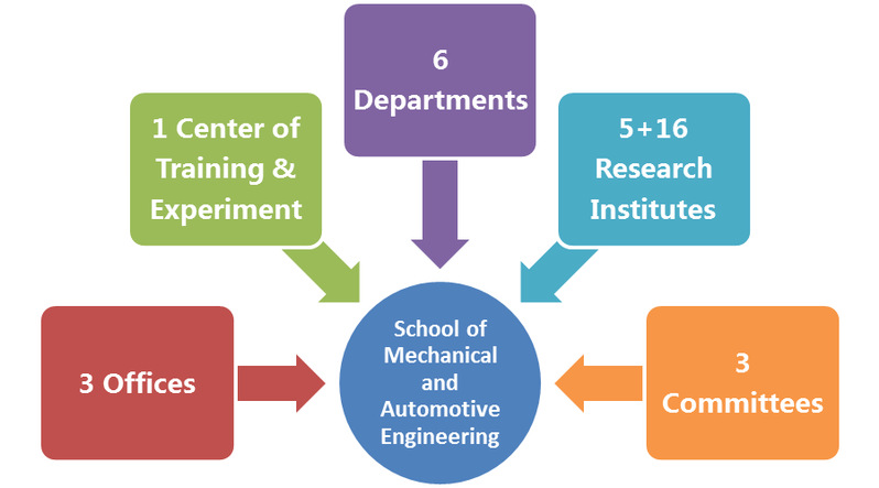 The school presently has six departments: Dept. of Mechanical Design, Dept. of Mechanical Manufacturing, Dept. of Mechatronic Engineering, Dept. of Energy and Power Engineering, Dept. of Automotive Engineering and Dept. of Automotive Service Engineering.