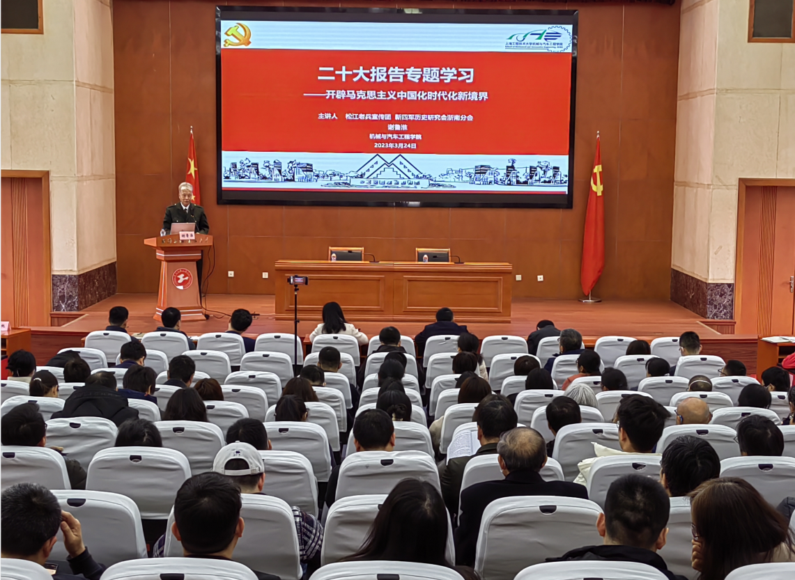 谢鲁淮老兵作了主题为《开辟马克思主义中国化时代化新境界》的专题报告。年逾古稀的谢老同志,依然精神矍铄,满怀激情的报告感染了现场每一位聆听者。谢老同志结合学习党的二十大精神心得体会和个人实际,从老兵视角、用老兵语言,宣讲党的百年奋斗成就,宣讲新时代十年的伟大变革,宣讲新时代的奋斗故事,激励全体教职员工不忘初心、感恩奋进,引导和教育当代老员工立志成为一个有理想、敢担当、能吃苦、肯奋斗的新时代好青年,在推动经济社会发展中展现更大担当和作为。