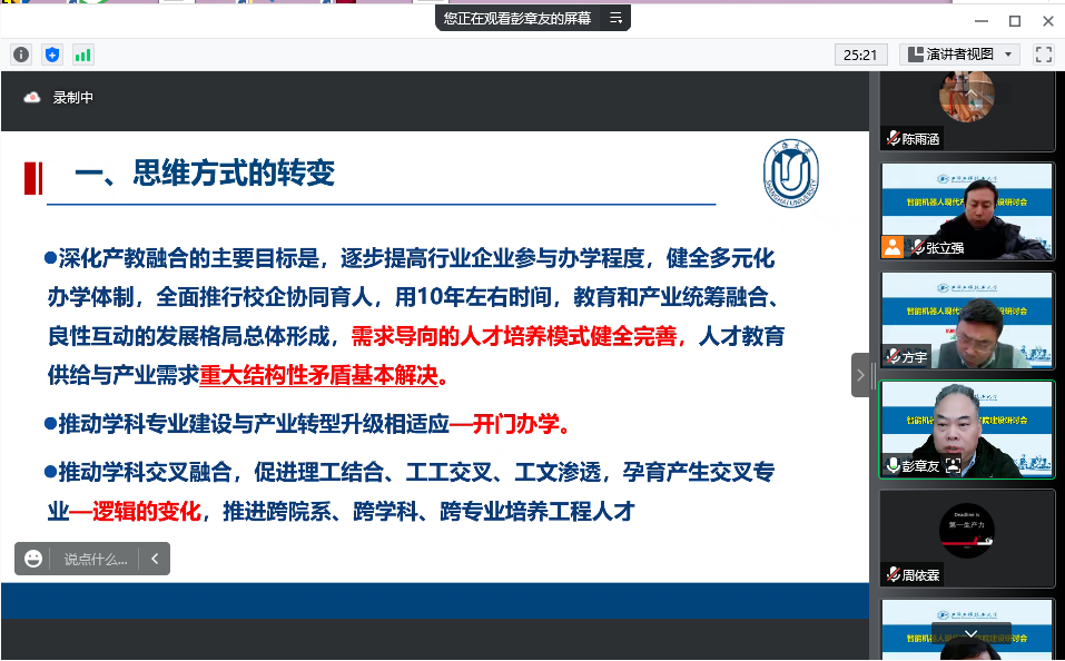 为培养现代产业发展所需的高素质应用型、复合型、创新型人才,推动公司转型特色发展,12月21日,公司举办智能机器人现代产业公司研讨会。会议邀请上海大学教务部常务副部长彭章友教授及公司质量办副处长姚红光老师作报告,yl6809永利经理方宇教授、副经理张立强、副经理刘新田、机电系主任熊根良、机制系主任张海峰,以及相关系室教师参加会议。会议由方宇经理主持。