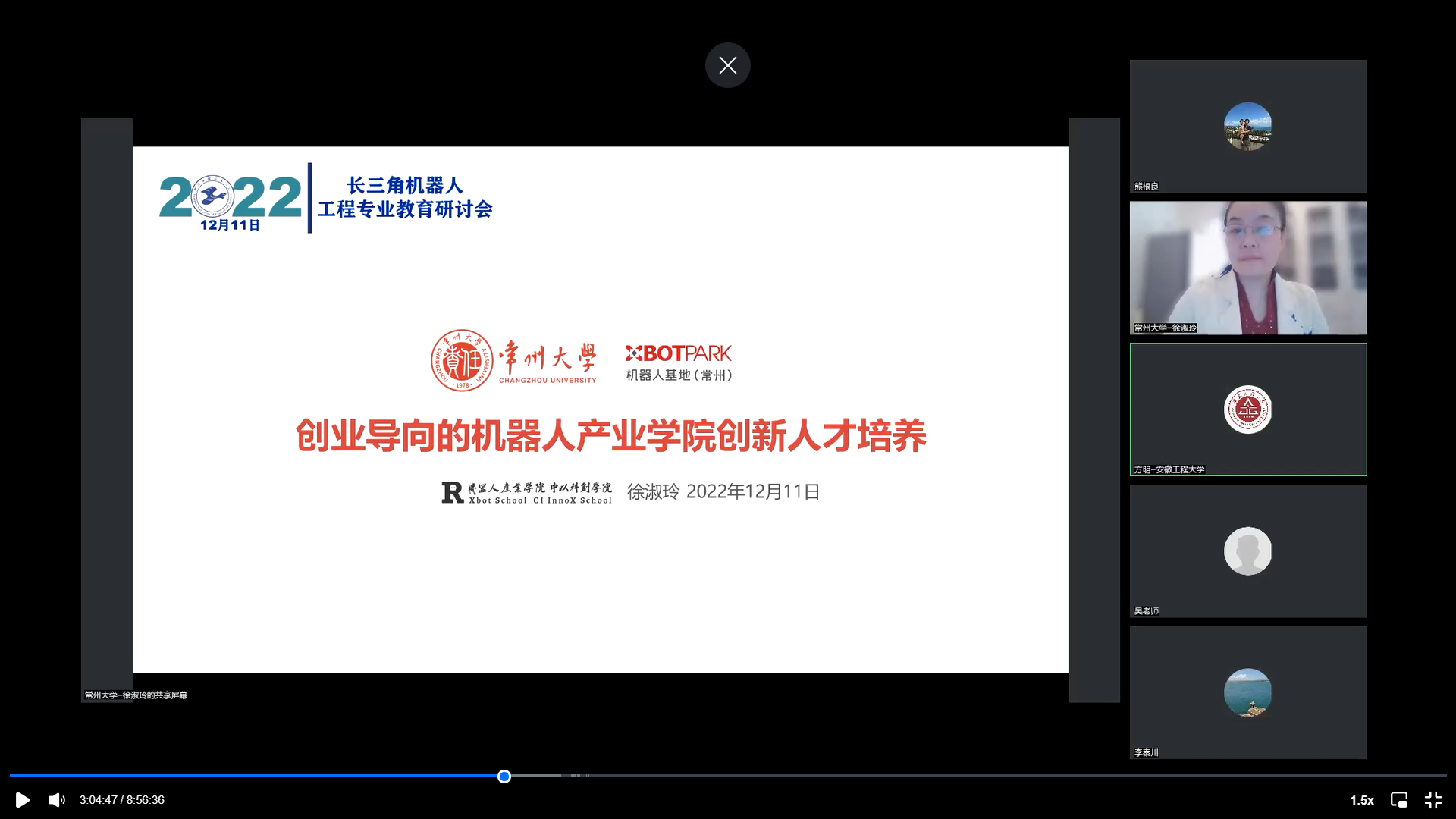 在“长三角机器人工程专业教育研讨会”主题特邀报告环节,周波、方明、陈春林、李秦川、徐淑玲、朱姿娜、刘瑀、李浩来、王豫平、秦志强等兄弟院校机器人领域专家从机器人工程专业人才培养模式、培养方案制定、机器人课程建设、团队队伍建设、机器人实践基地建设、机器人竞赛、校企产学研合作等进行了报告分享。