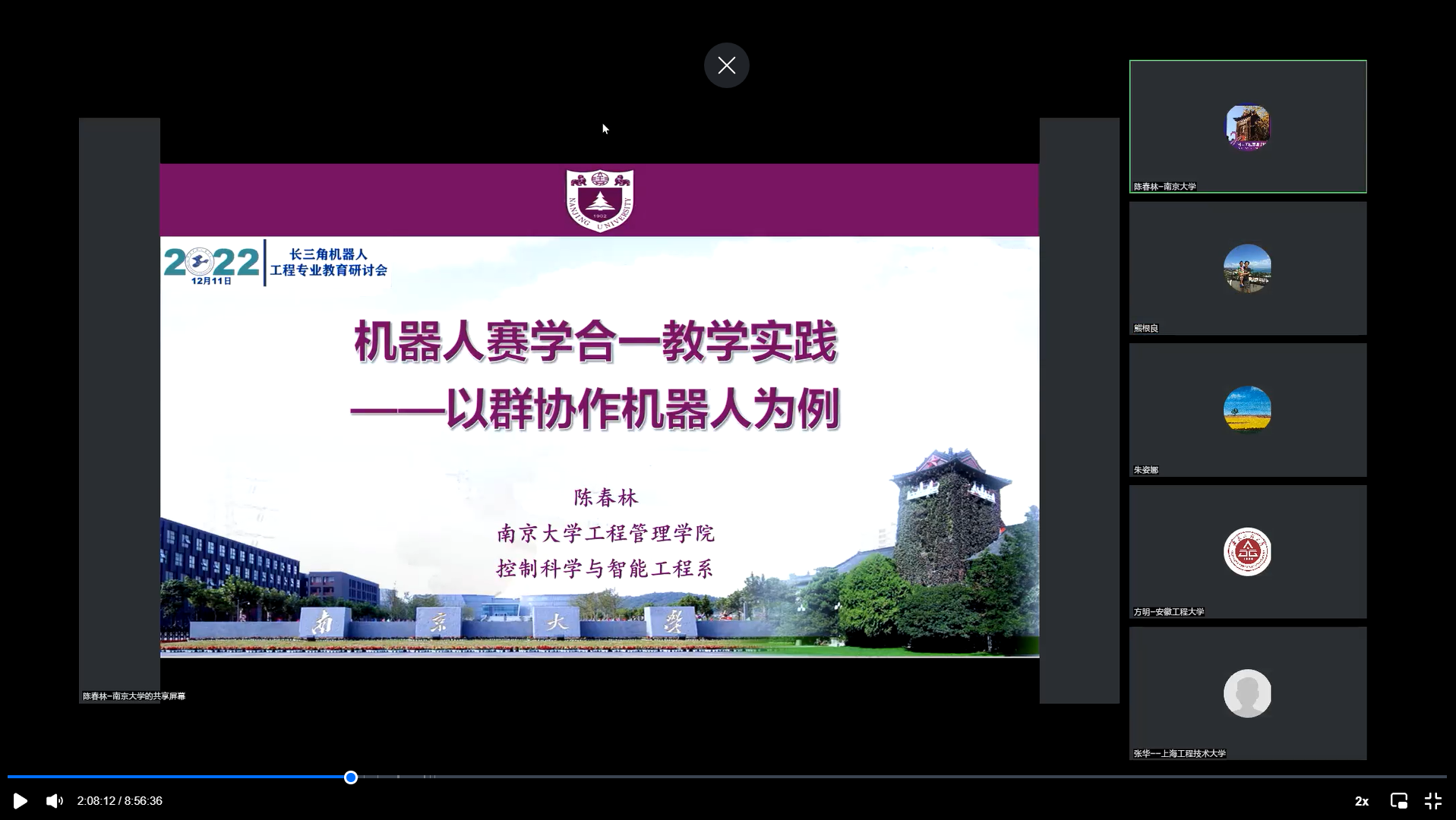 南京大学工程管理公司副经理陈春林教授做了主题为《机器人赛学合一教学实践——以群协作机器人为例》的专题报告。他以群舞蹈协作机器人为例,从赛学合一、参赛经历、实践效果以及整个过程的体会做了深入讲解,体现机器人竞赛在机器人工程专业人才培养过程中的重要意义。