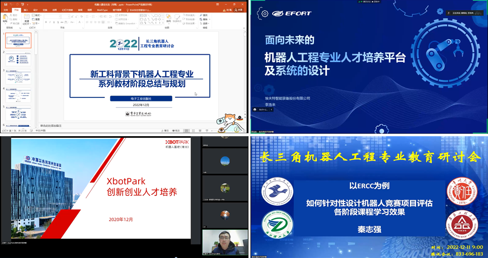 此外,埃夫特中央研究院R2研究中心李浩来研发总监、XbotPark(常州)基地负责人、中以科创公司副经理王豫平、全童科教有限公司秦志强董事长、电子工业出版社高等教育分社刘瑀责任编辑等分别从企业和出版社的角度分别做了《面向未来的机器人工程专业人才培养平台及系统的设计》、《机器人工程专业创新创业人才的培养》、《如何针对性设计机器人竞赛项目评估各阶段课程学习效果——以ERCC为例》、《新工科背景下机器人工程专业系列教材阶段总结与规划》的报告。