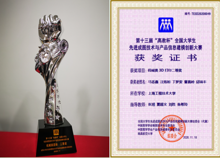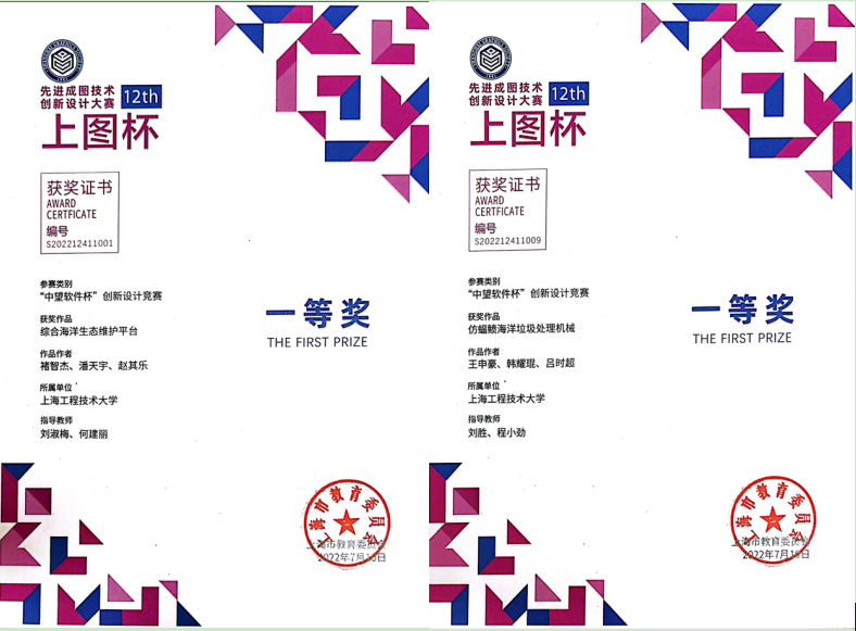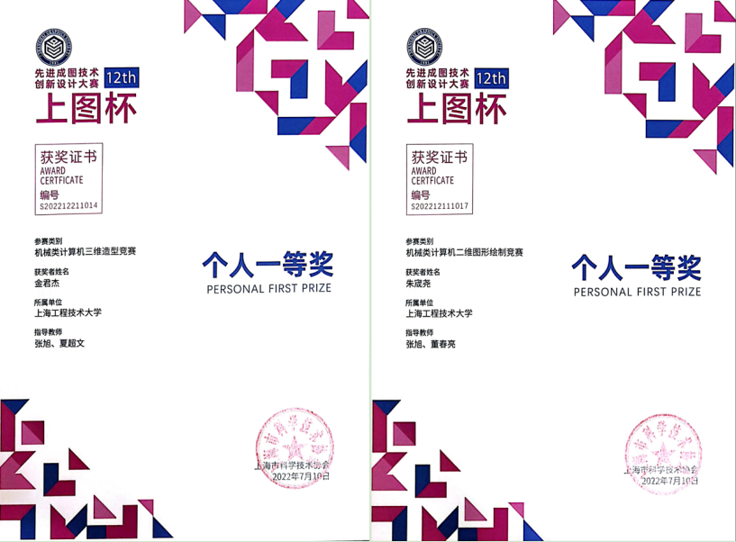 通过组织“上图杯”竞赛的前期培训、选拔,每年遴选出多只二维团队、三维团队和创新团队,涉及涵盖100多人次参加竞赛,指导老师9人。参加包括机械类二维、三维建模竞赛,创新设计大赛三个类别的比赛,每年获得上海市团体奖10多项,个人奖20多项。其中代表性的奖项如下: