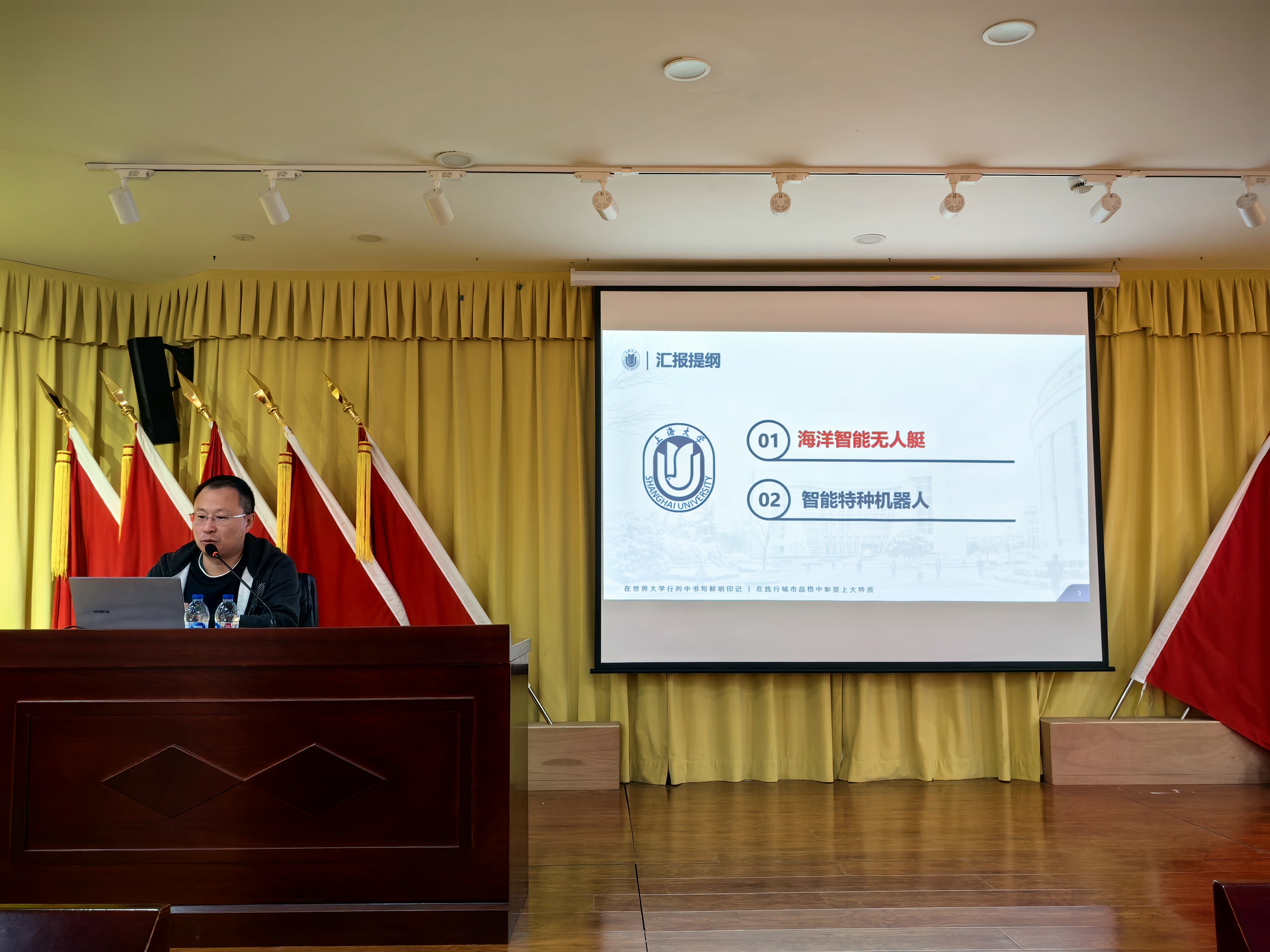 杨扬教授向与会人员讲解了“海洋智能无人艇”这一技术。该技术具备有自主导航、自主避障能力,并可以自主完成海面海下环境信息感知、目标探测及各种作业任务的水面无人平台,是空天地海无人系统的重要组成部分和重要节点,特别是能够整合无人机、海面无人装备和水下机器人跨域网络的关键节点。海洋自主探测无人艇控制方式主要有:航迹精准跟踪控制,任务载荷控制,立体组合避障控制。它具有体积小、吃水浅、行动灵活的特点,适合大陆岛礁浅水区执行自主测绘和海洋勘探任务。海洋智能无人艇应用前景广阔,无人艇涉及机械、电气、计算机、人工智能等多学科交叉融合,是人工智能产业发展的代表性产品之一,将服务我国海洋强国战略。大会中充满着学术与科研的氛围感,部分硕士研究生也参加了这个会议,他们在大会中认真听取杨教授的汇报,思考着与之相关的知识,并在会议结束后踊跃提出问题,与杨教授交流探讨。