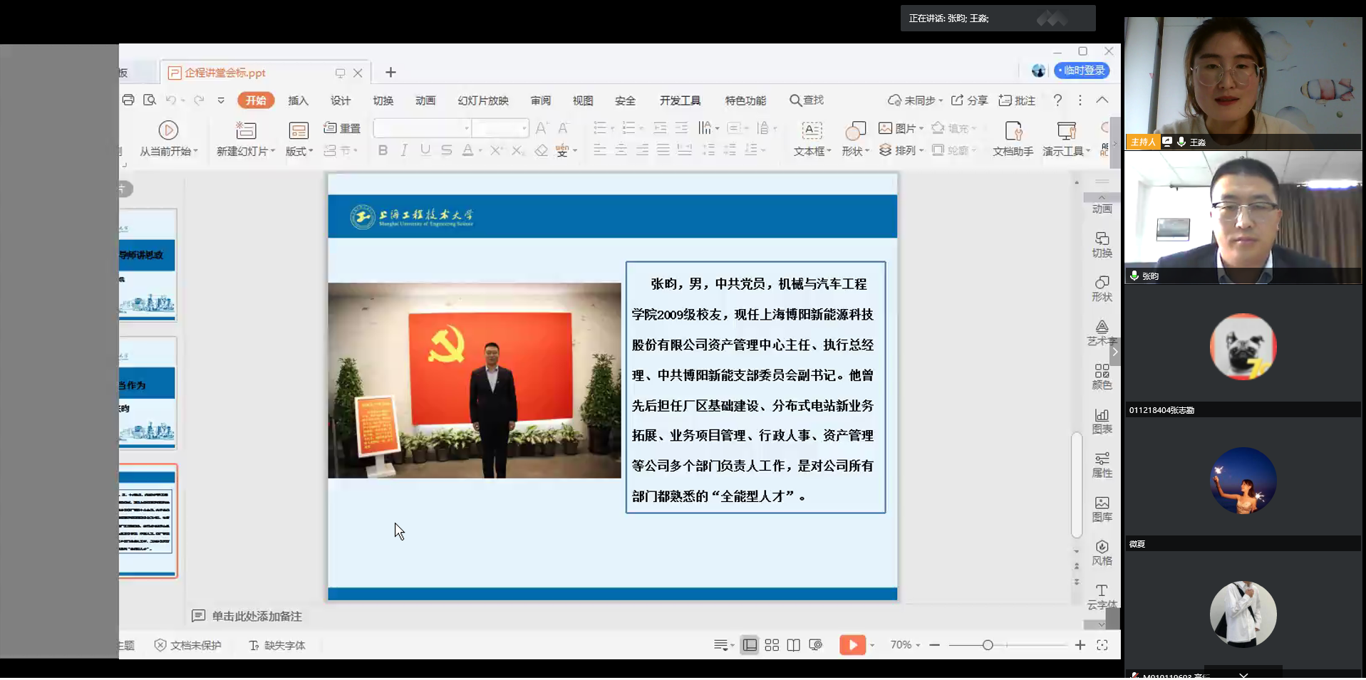 在抗击疫情的特殊时期,为进一步落实立德树人根本任务,打造课程思政生态圈,实现专业教育与思想教育的同向同行,yl6809永利于4月17日邀请公司产学合作基地单位上海博阳新能源科技股份有限公司资产管理中心主任、执行总经理、中共博阳新能支部委员会副书记,同时也是公司优秀员工的张昀员工通过“云端”企程讲堂为学弟学妹们分享他“历练成长,担当作为”的故事。