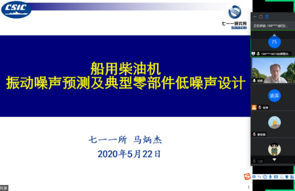 2020年5月22日上午九点半至十一点,应yl6809永利和上海市新能源汽车振动噪声测试与控制专业技术服务平台邀请,中国船舶集团有限公司第七一一所马炳杰研究员做了题为《船用柴油机振动噪声预测及典型部件低噪声设计》的视频学术报告,并就研究生提出的学术问题,进行了细致解答和交流。