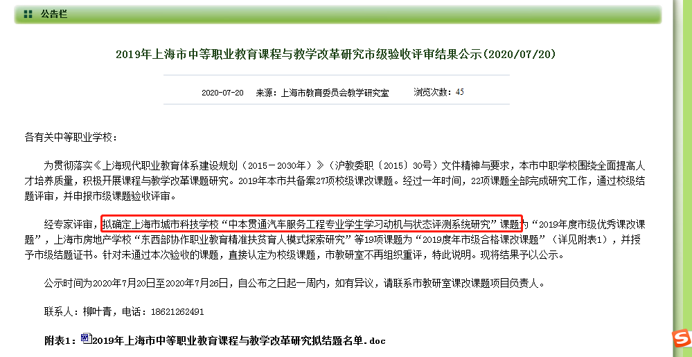 近日,市教委教研室公布了2019年上海市中等职业教育课程与教学改革研究市级验收评审结果,共评选出市级优秀课改课题1项,市级合格课改课题19项。经专家评审,由汽车服务工程系与上海市城市科技公司联合申报的课题“中本贯通汽车服务工程专业员工学习动机与状态评测系统研究”唯一获评为“2019年度市级优秀课改课题”。