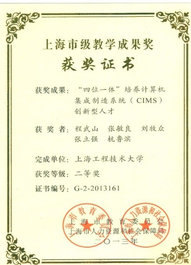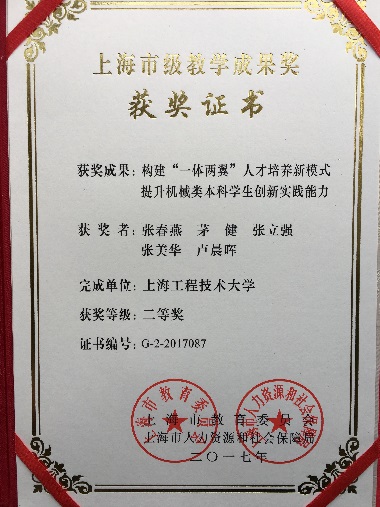 4 | 构建“一体两翼”人才培养新模式提升机械类本科员工创新实践能力 | 上海市教学成果奖二等奖 | 张立强 茅健 | 2017 |