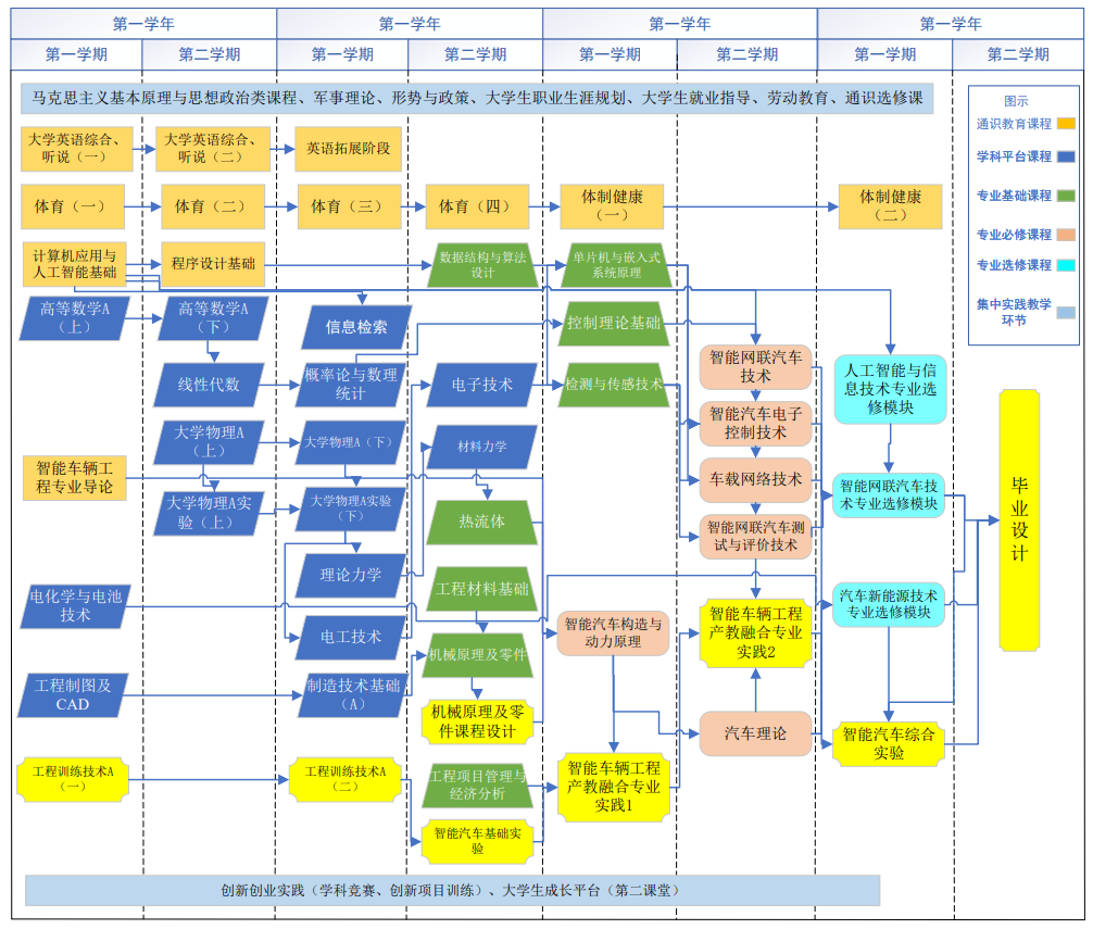 核心课程:数据结构与算法设计、单片机与嵌入式系统原理、机械原理及零件、电化学基础与电池技术、数据结构与算法设计、车载传感器与信号处理、汽车控制工程基础、工程项目管理与经济分析、智能汽车底盘构造与原理、现代汽车动力系统、智能车辆感知技术、智能汽车电子技术、车用电机原理及控制技术、智能车辆决策与规划技术、汽车理论、智能汽车设计等。